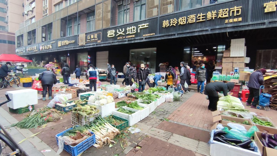 走出超市,漫步街邊,沿街陸續(xù)開業(yè)的小商鋪,同樣展現(xiàn)著這個(gè)城市久違的活力。在楓葉廣場2期小區(qū)西南門,正在營業(yè)的蔬菜店、水果店生意很是不錯(cuò),新鮮的茄子、青筍、白菜用紙箱裝著,被整整齊齊地?cái)[在沿街人行道上,不少市民正在選購心儀的菜品。