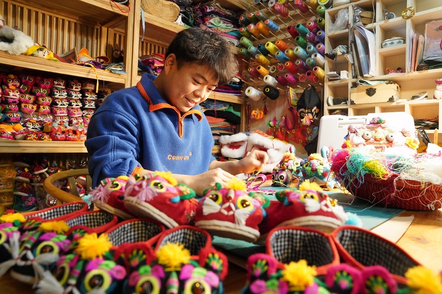“老虎是百獸之王,是保平安的吉祥物,也是我們民俗文化中‘福’字的諧音。”夏璐璐介紹,他在設(shè)計(jì)制作虎頭帽、虎頭鞋的過程中,會(huì)使用不同的手法、材質(zhì)和造型,這也讓小老虎看起來更加可愛。