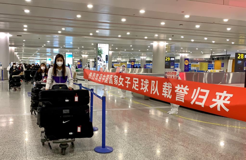 2月7日,中國女足隊員抵達(dá)上海浦東國際機(jī)場。新華社發(fā)(中國東方航空供圖)