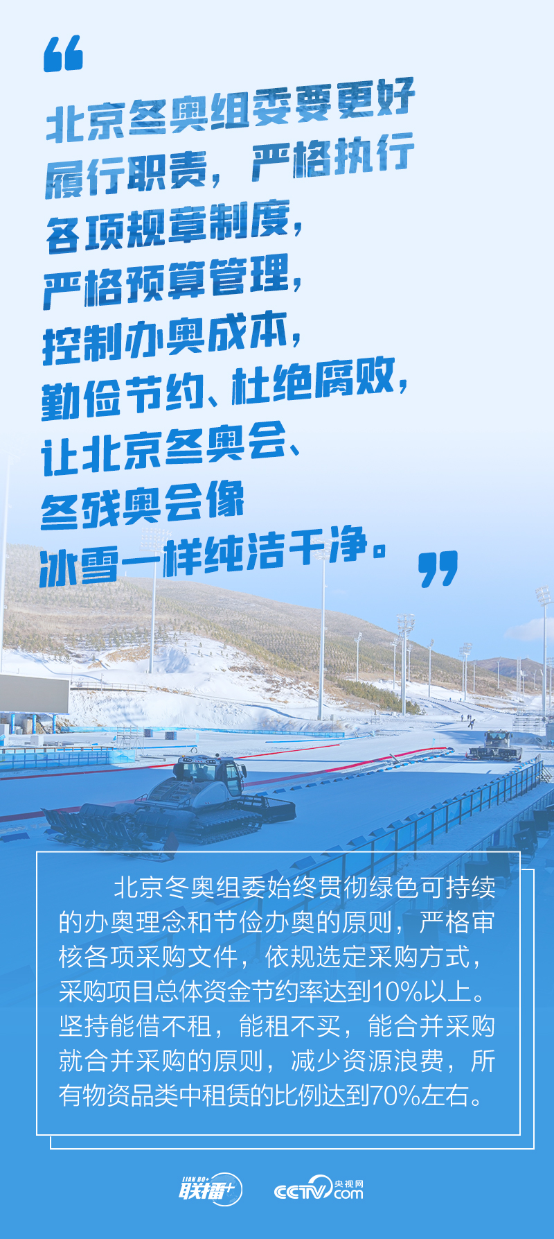 冬奧會(huì)籌辦過(guò)程中,總書記始終嚴(yán)格要求把勤儉節(jié)約作為“廉潔辦奧”的重要內(nèi)容。2021年1月20日召開的會(huì)議進(jìn)一步提出要做好簡(jiǎn)化辦賽工作,從實(shí)際出發(fā),精簡(jiǎn)非必要環(huán)節(jié)、活動(dòng)和人員數(shù)量。