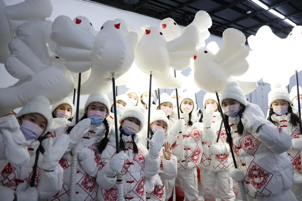 1月27日,北京2022年冬奧會(huì)開(kāi)幕式《雪花》幕后。圖為“小鴿子”們?cè)诓逝徘昂驁?chǎng)。新華社記者許雅楠攝