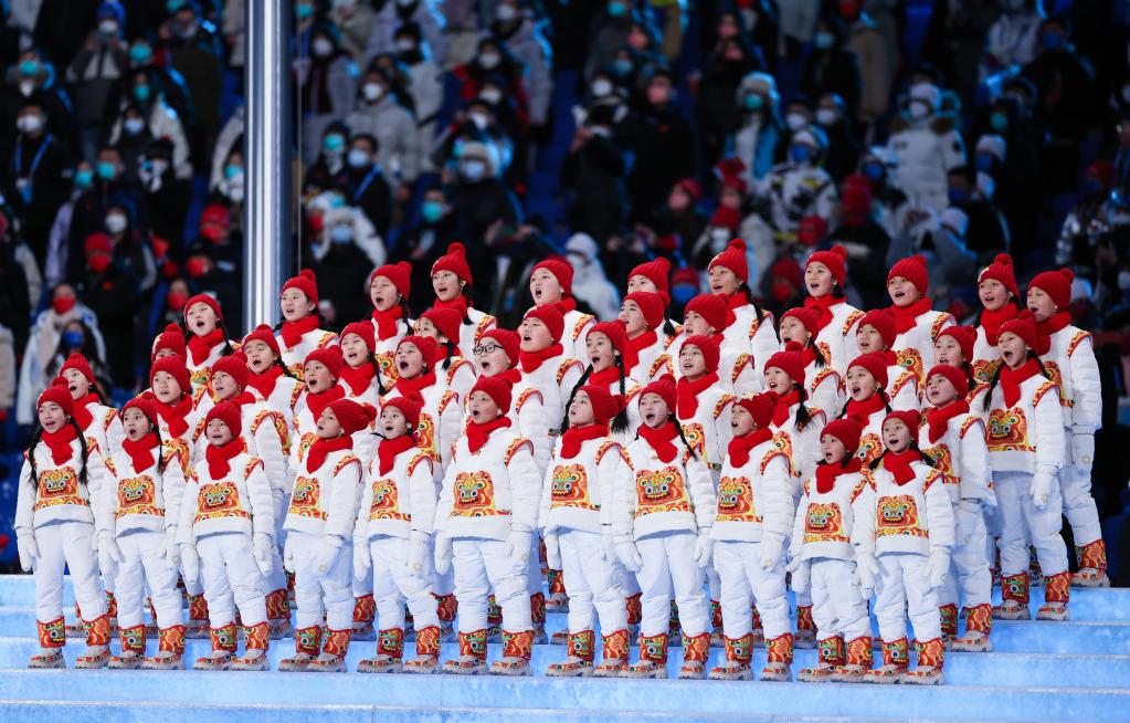2月4日晚,第二十四屆冬季奧林匹克運(yùn)動(dòng)會(huì)開(kāi)幕式在北京國(guó)家體育場(chǎng)舉行。這是“馬蘭花兒童合唱團(tuán)”用希臘語(yǔ)在開(kāi)幕式上歌唱。新華社記者曹燦攝