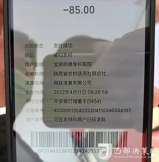 做核酸的市民提供的繳費(fèi)截圖發(fā)現(xiàn),他們兩個(gè)人做完核酸繳費(fèi)85元,分別要做咽拭子和鼻拭子兩個(gè)項(xiàng)目,收款商戶(hù)單位全稱(chēng)為:寶雞明德骨科醫(yī)院。