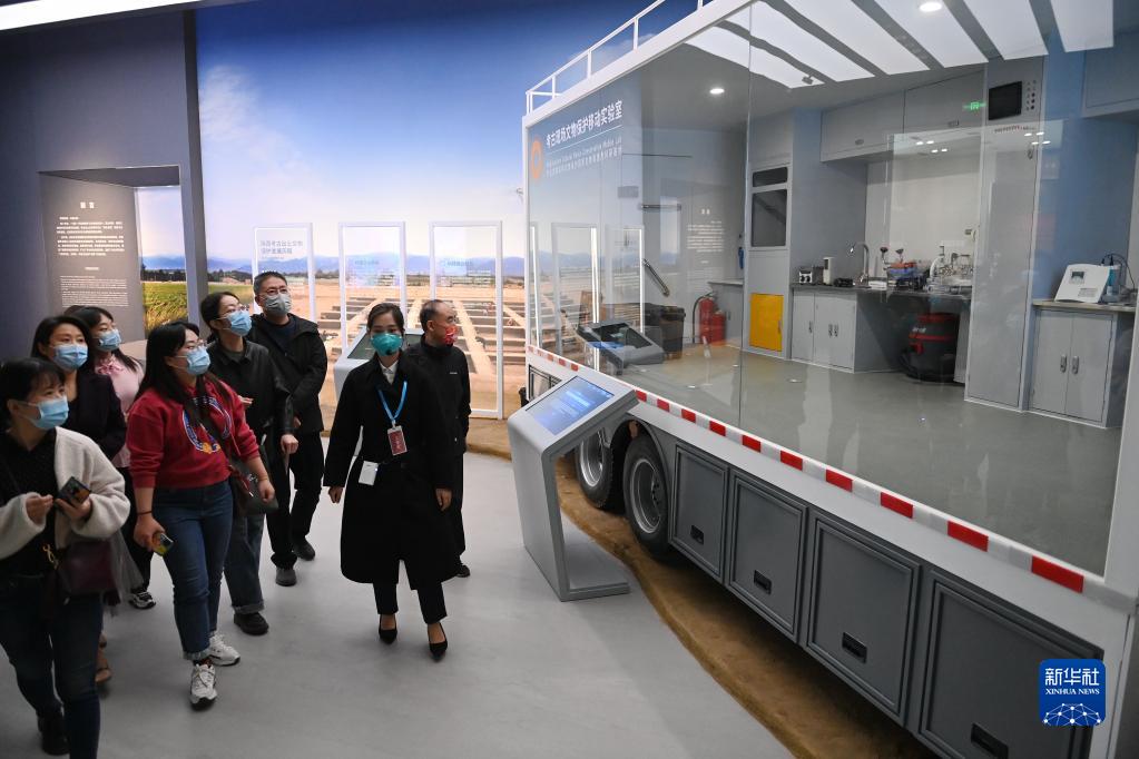 4月28日,游客在陜西考古博物館內(nèi)參觀考古現(xiàn)場(chǎng)文物保護(hù)移動(dòng)實(shí)驗(yàn)室。新華社記者 李一博 攝