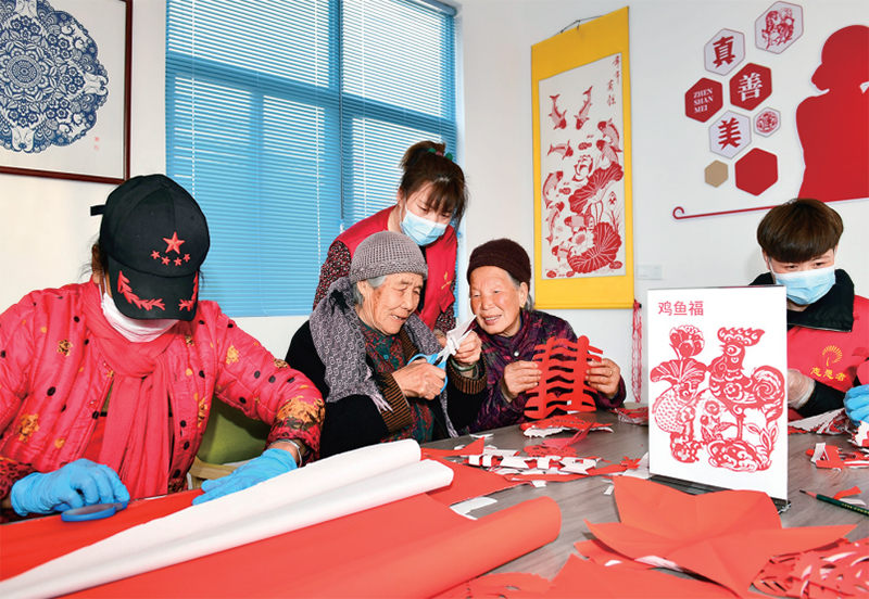 山東省日照市嵐山區(qū)按照就近、普惠原則建設(shè)養(yǎng)老服務(wù)中心,并組建志愿服務(wù)隊為老人提供助餐、助潔、助醫(yī)等愛心服務(wù)。圖為2022年2月27日,志愿者在日照市嵐山區(qū)虎山鎮(zhèn)黃家峪村養(yǎng)老服務(wù)中心陪老人剪紙、聊天?!⌒氯A社記者 郭緒雷/攝