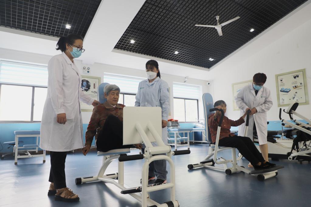 5月27日,在山東省博興縣呂藝鎮(zhèn)老年公寓醫(yī)養(yǎng)康復(fù)中心,醫(yī)護(hù)人員指導(dǎo)農(nóng)村老人利用專(zhuān)業(yè)器械進(jìn)行康復(fù)鍛煉。(博興縣委宣傳部供圖)