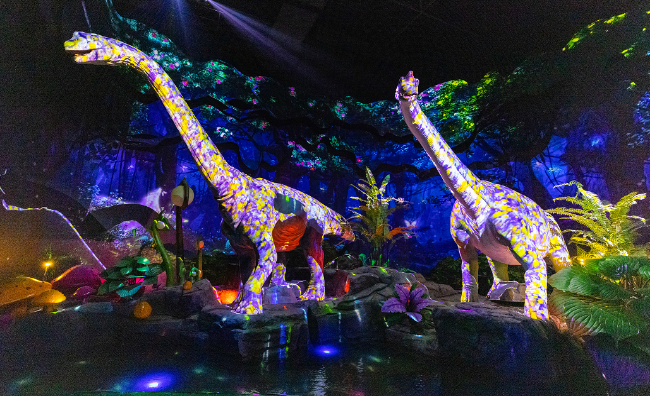在大型室內(nèi)河道漂流項目《河谷探秘》中,游客乘坐漂流船緩緩駛?cè)肟铸埡庸?,穿越瀑布流水、植被茂密的雨林秘境,近距離接觸眾多恐龍和原始生物族群。神秘的河谷氛圍,有趣的恐龍互動,引發(fā)現(xiàn)場游客陣陣驚呼。