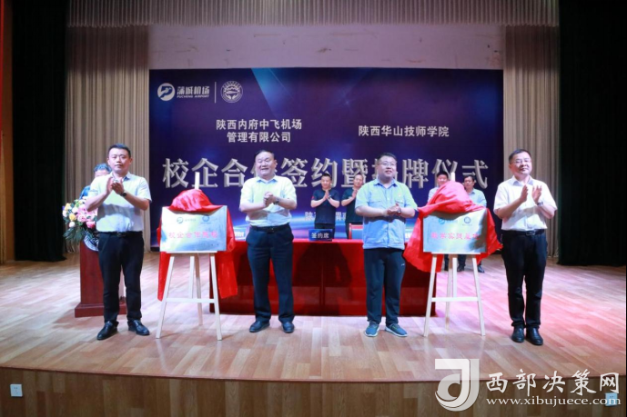 陜西內府中飛機場管理有限公司董事長許孟晉、總經理魏新科與華山國際教育集團董事長任永敏、總裁張濤共同為“技能人才培養(yǎng)基地”揭牌。