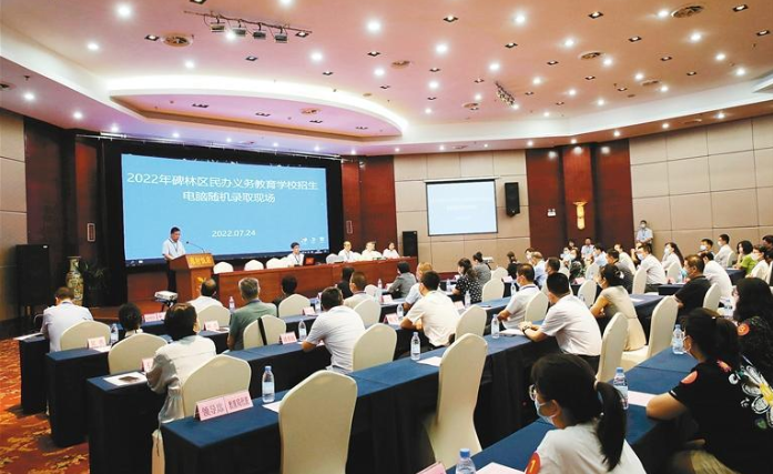 7月24日上午,我市各相關(guān)區(qū)縣、開發(fā)區(qū)統(tǒng)一實施民辦義務(wù)教育學(xué)校電腦隨機錄取工作。本報記者作為媒體監(jiān)督員,來到位于雍村飯店的碑林區(qū)民辦義務(wù)教育學(xué)校招生電腦隨機錄取工作現(xiàn)場,實地觀察體驗“搖號”全過程。