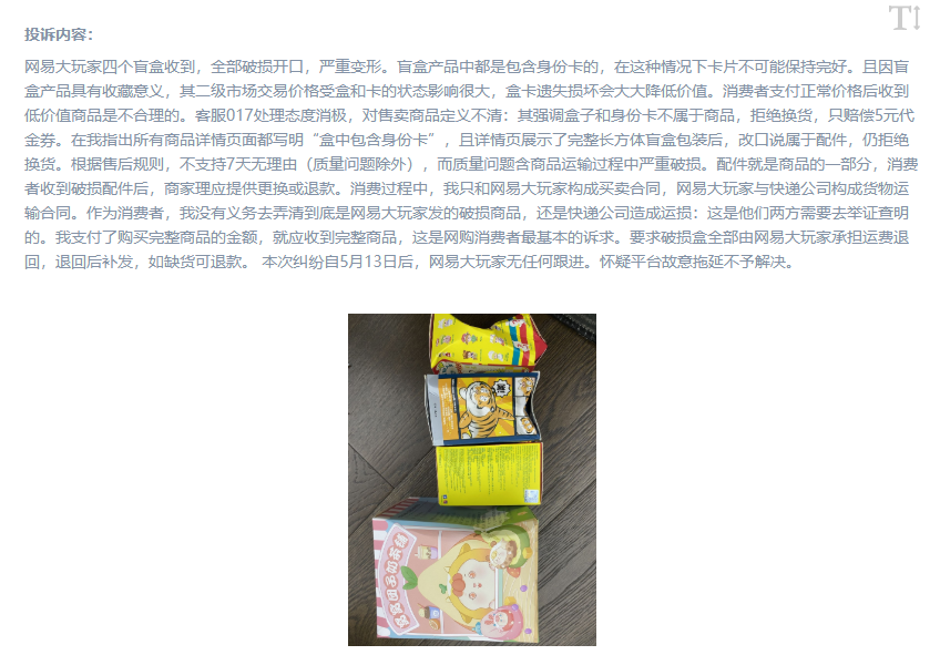 今年5月,在人民網“人民投訴”平臺上,一位網友“吐槽”了自己購買盲盒時遇到的“糟心事”,其表示自己在某平臺購買了盲盒玩具,收到時卻發(fā)現(xiàn)商品破損,但商家不同意更換,并故意拖延不予解決。