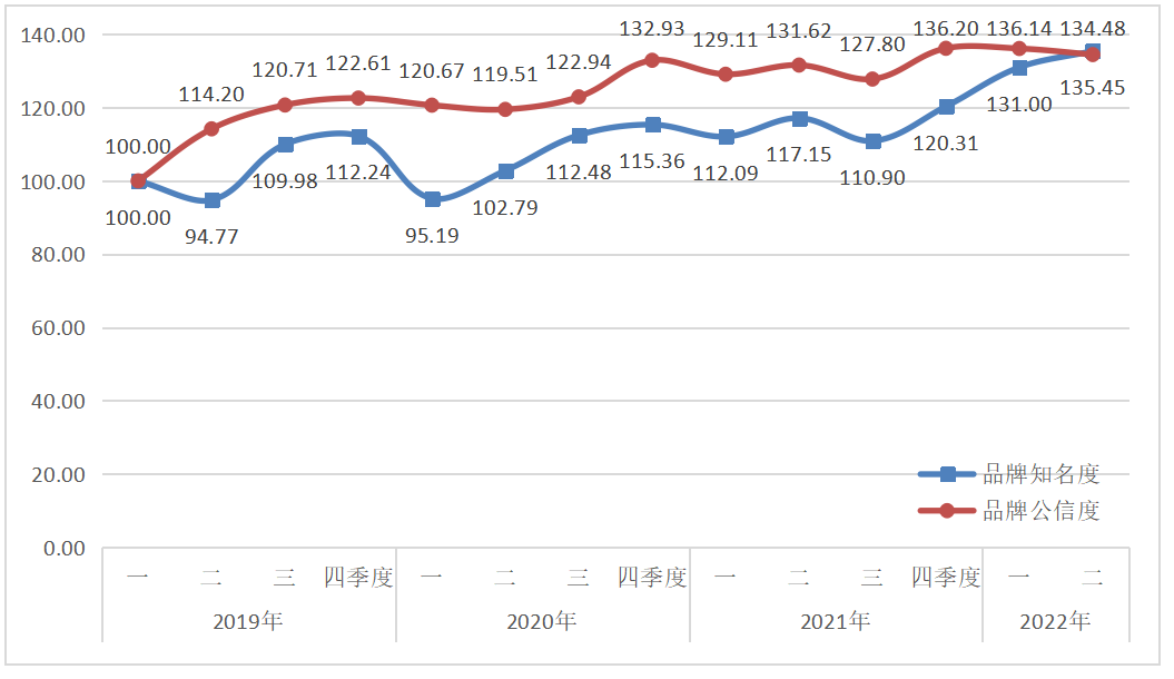 西鳳酒品牌傳播力指數(shù)2022年二季度運行監(jiān)測顯示,西鳳酒品牌傳播力略有提升,達到134.96點。通過節(jié)日宣傳、交流拜訪、基酒項目建設等活動,西鳳酒品牌知名度和品牌公信度分別達到135.45點和134.48點。