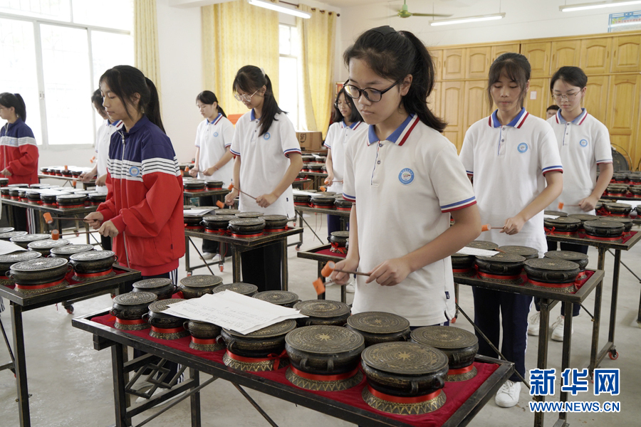 東蘭縣民族中學(xué)學(xué)生在演奏音樂(lè)銅鼓。新華網(wǎng) 谷雨 攝