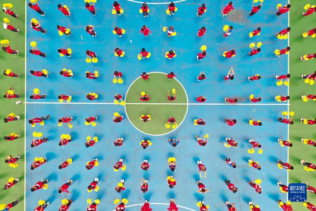 9月1日,貴州省貴陽(yáng)市開陽(yáng)縣第一小學(xué)學(xué)生在跳自編舞《天天向上》(無(wú)人機(jī)照片)。新華社發(fā)(袁福洪 攝)