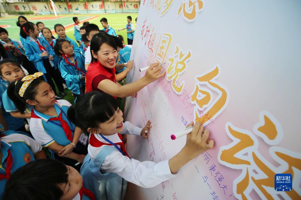 9月1日,山東省郯城縣郯城街道龍泉社區(qū)工作者與小學(xué)生一起寫下對(duì)祖國(guó)的祝福語(yǔ)。新華社發(fā)(張春雷 攝)