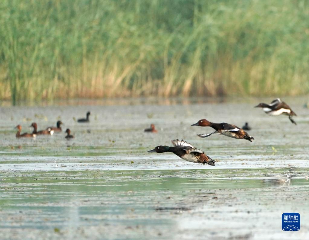 這是在河北白洋淀淀區(qū)拍攝的青頭潛鴨與白眼潛鴨混群(2022年7月22日攝)。新華社記者 邢廣利 攝