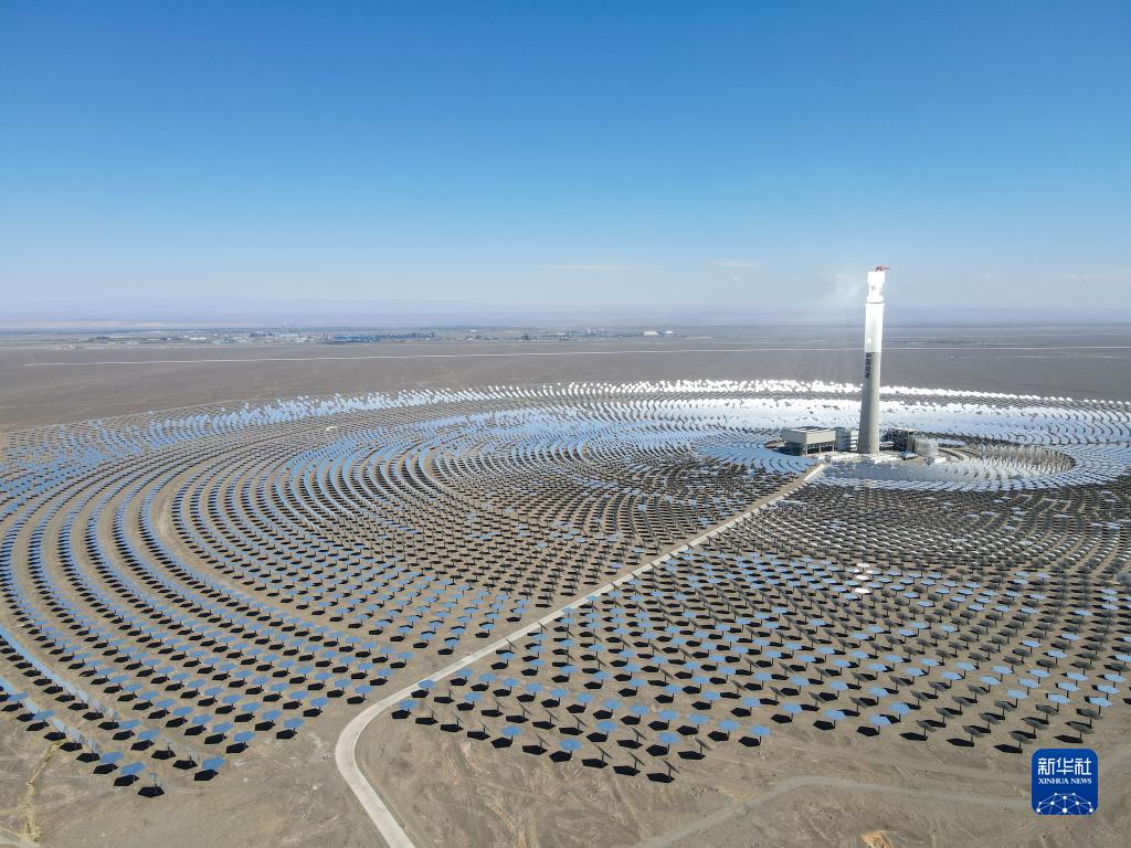 在新疆伊吾縣淖毛湖鎮(zhèn)拍攝的哈密50兆瓦熔鹽塔式光熱發(fā)電站(2021年8月22日攝,無人機(jī)照片)。作為新疆第一座光熱發(fā)電站,哈密50兆瓦熔鹽塔式光熱發(fā)電站不僅污染物零排放,還通過儲(chǔ)存熱能實(shí)現(xiàn)24小時(shí)持續(xù)發(fā)電。新華社記者 高晗 攝