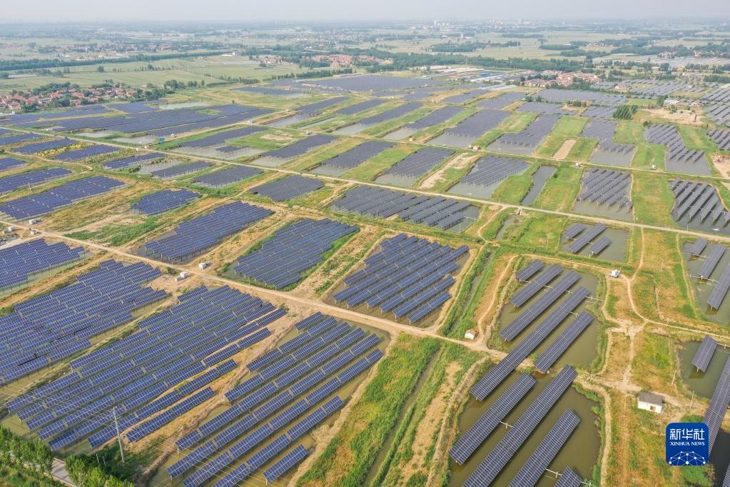 山東高青縣湖東村周邊建設(shè)的千余畝漁光互補(bǔ)養(yǎng)殖場(chǎng)(2022年5月24日攝,無人機(jī)照片)。新華社記者 朱崢 攝