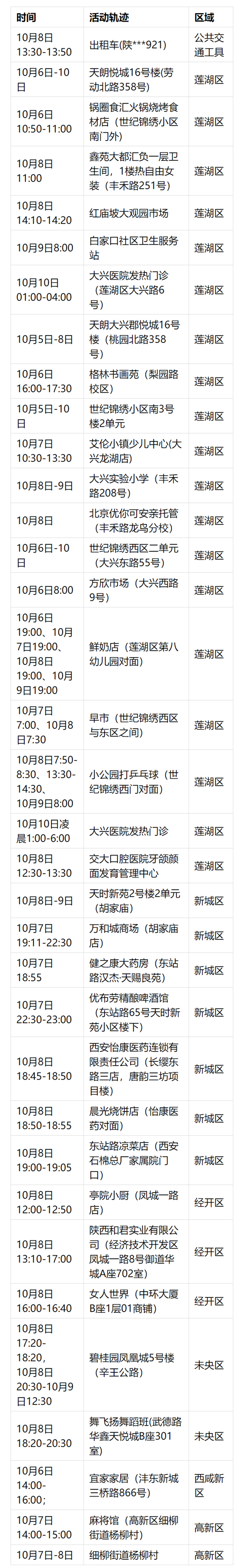10月10日0-24時(shí),西安市新增11例本土感染者(4例確診病例,7例無癥狀感染者),其中4例為省外來陜返陜?nèi)藛T,7例為已診斷病例的密切接觸者;2例主動(dòng)報(bào)備后在卡口即管控,6例在集中隔離中發(fā)現(xiàn),3例在主動(dòng)就醫(yī)時(shí)發(fā)現(xiàn)。經(jīng)初步流調(diào),病例在隔離管控前涉及到的活動(dòng)軌跡為: