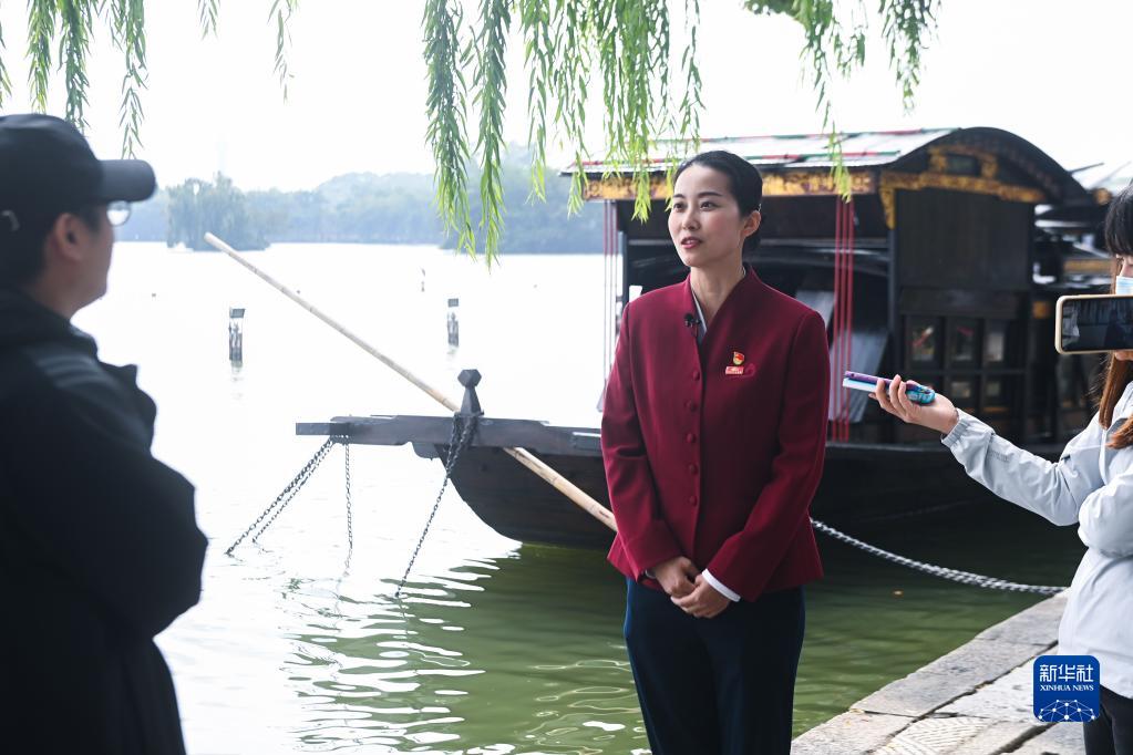 10月16日,在浙江省嘉興市,南湖革命紀(jì)念館講解員張一在接受采訪。新華社記者 徐昱 攝