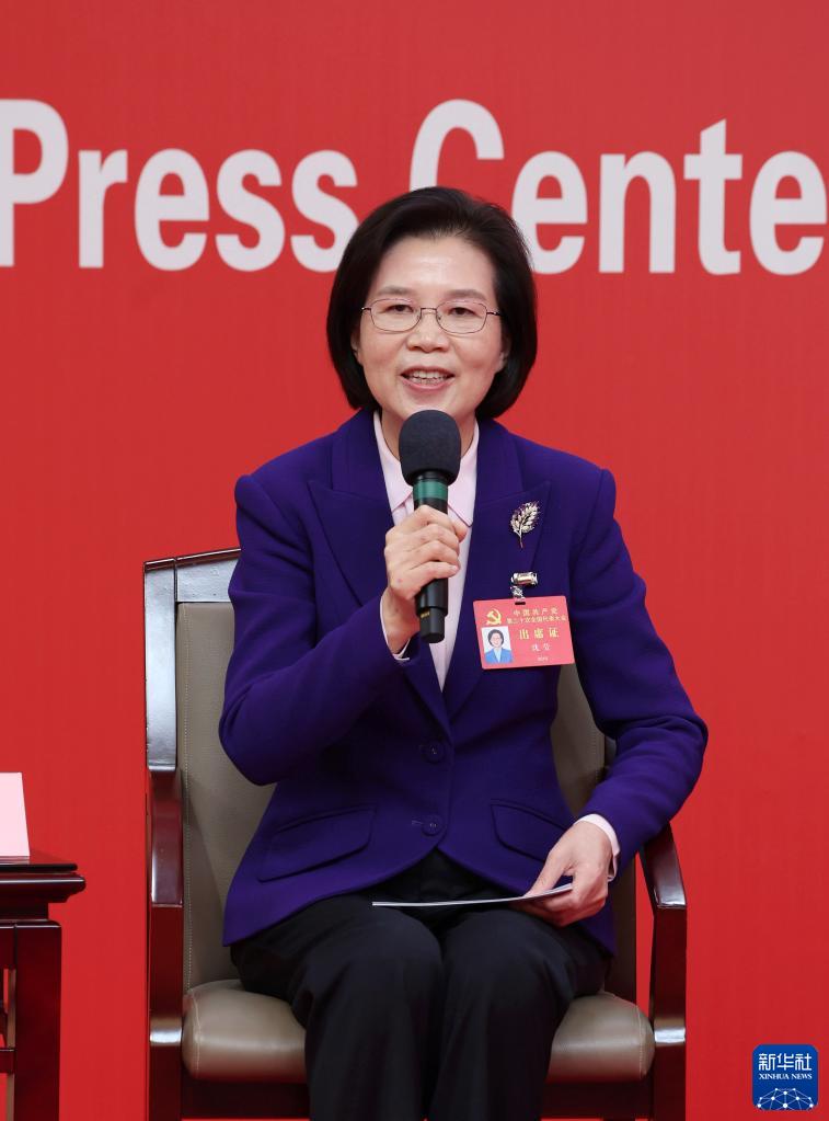 10月18日,中國(guó)共產(chǎn)黨第二十次全國(guó)代表大會(huì)新聞中心舉行集體采訪。黑龍江、上海、江蘇、浙江、安徽、福建、江西代表團(tuán)新聞發(fā)言人出席,介紹代表團(tuán)學(xué)習(xí)討論二十大報(bào)告情況,并回答記者提問。這是黑龍江省委常委、副省長(zhǎng),省政府黨組副書記沈瑩在回答記者提問。新華社記者 張玉薇 攝