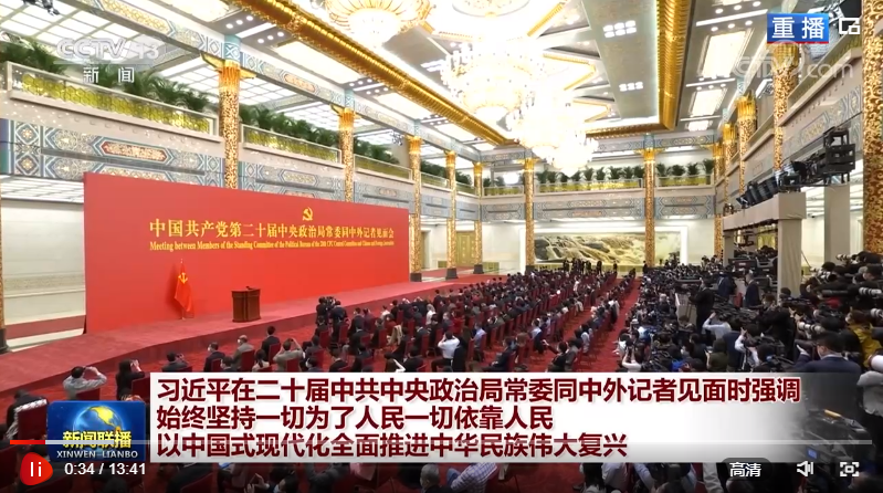 剛剛在中國共產(chǎn)黨第二十屆中央委員會第一次全體會議上當(dāng)選的中共中央總書記習(xí)近平和中共中央政治局常委李強(qiáng)、趙樂際、王滬寧、蔡奇、丁薛祥、李希,23日中午在人民大會堂同采訪中共二十大的中外記者親切見面。