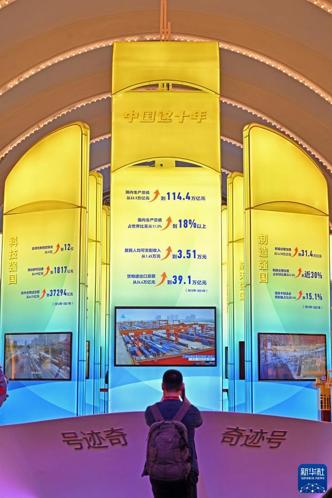 觀眾在“奮進(jìn)新時代”主題成就展中央綜合展區(qū)內(nèi)拍攝中國經(jīng)濟(jì)“奇跡號”巨輪模型(2022年10月8日攝)。新華社記者 李鑫 攝