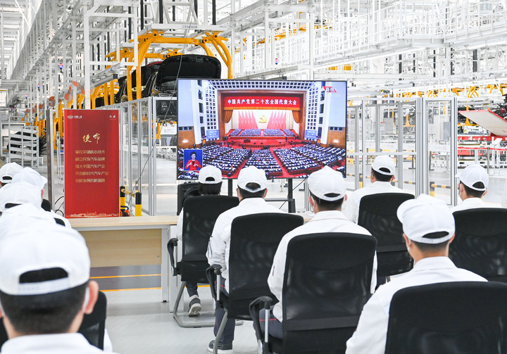 10月16日,在吉林省長春市中國第一汽車集團有限公司紅旗繁榮工廠,職工在收看中國共產(chǎn)黨第二十次全國代表大會開幕會。新華社記者 顏麟蘊 攝