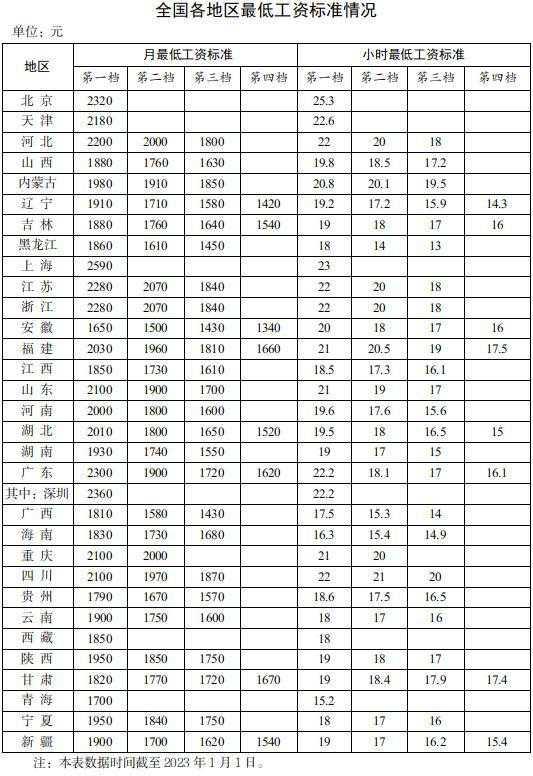 全國(guó)各地區(qū)最低工資標(biāo)準(zhǔn)情況(截至2023年1月1日),來(lái)自人社部網(wǎng)站