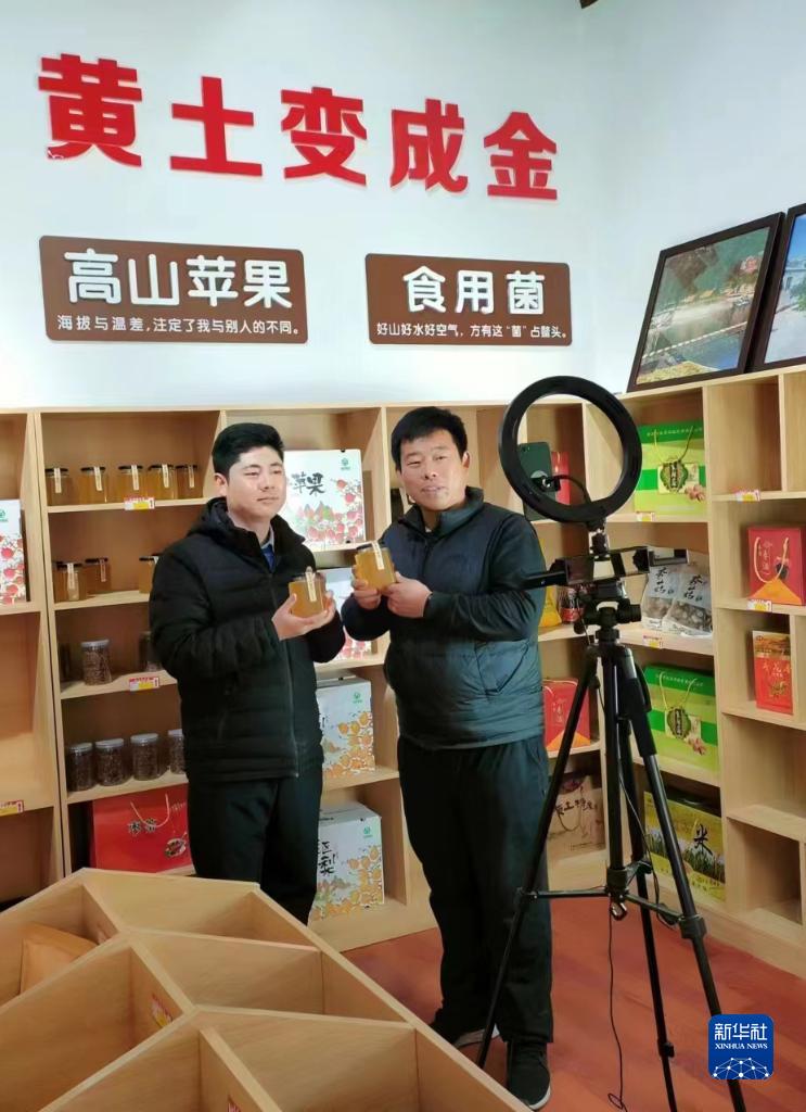 2022年11月6日,在河北省阜平縣顧家臺(tái)村的電商直播間,顧家臺(tái)村第一批返鄉(xiāng)創(chuàng)業(yè)的“90后”青年顧騰飛(右)在直播賣貨。新華社發(fā)(曹建平 攝)