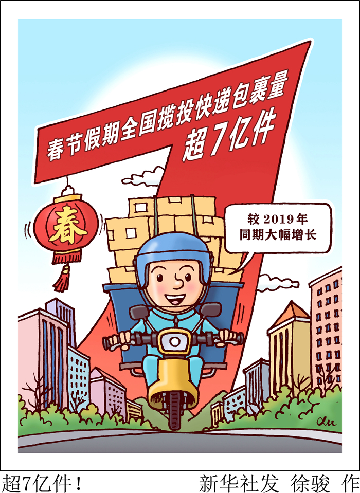 國家郵政局監(jiān)測數(shù)據(jù)顯示,1月21日至27日春節(jié)假期期間,全國郵政快遞業(yè)攬收快遞包裹約4.1億件,與去年春節(jié)假期相比增長5.1%,較2019年春節(jié)假期增長192.9%;投遞快遞包裹3.3億件,與去年春節(jié)假期相比增長10.0%,較2019年春節(jié)假期增長254.8%。