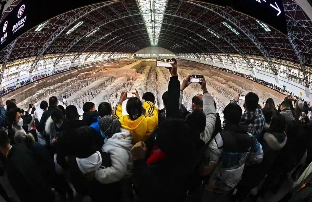 1月23日(大年初二),秦始皇帝陵博物院迎來了最大承載量,來自全國各地的觀眾參觀熱情高漲,該院內(nèi)外重現(xiàn)了久別的客流高峰。兵馬俑園區(qū)人山人海,熙熙攘攘,觀眾都在有序排隊進行參觀。13時,秦始皇帝陵博物院已經(jīng)達到最大承載量,所有門票售罄,院方充分感受到了大家的熱情。