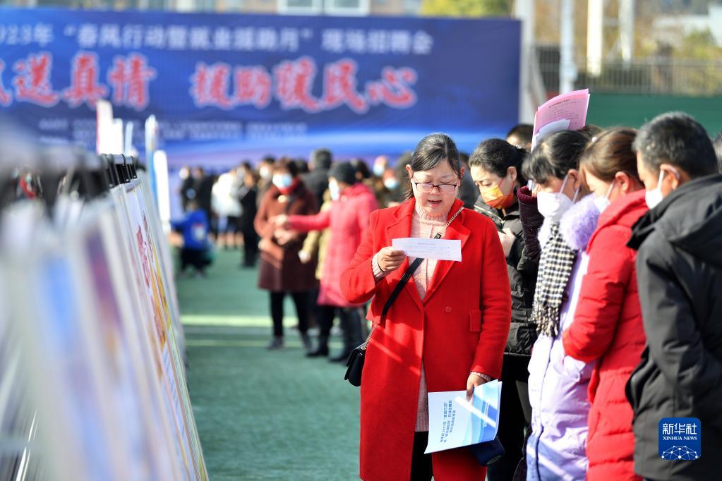 1月31日,求職者在湖北省襄陽市保康縣2023年春風行動暨就業(yè)援助月現(xiàn)場招聘會上了解崗位信息。新華社發(fā)(楊韜攝)