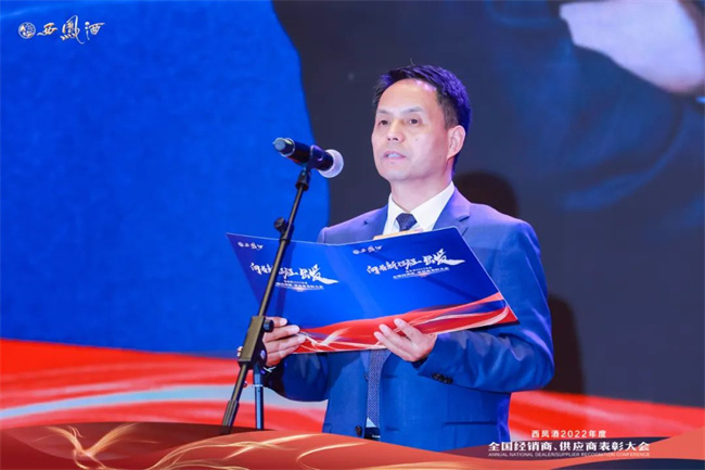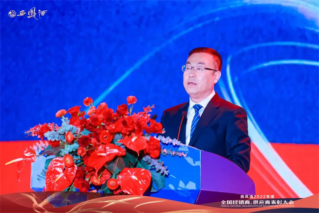 西鳳集團(tuán)公司黨委副書記郭拴新致祝酒辭,感謝參會(huì)經(jīng)銷商和一直以來給予西鳳大力支持的各界朋友,希望與大家攜手共進(jìn)、并肩同行,共同開創(chuàng)西鳳事業(yè)高質(zhì)量發(fā)展的絢麗篇章。