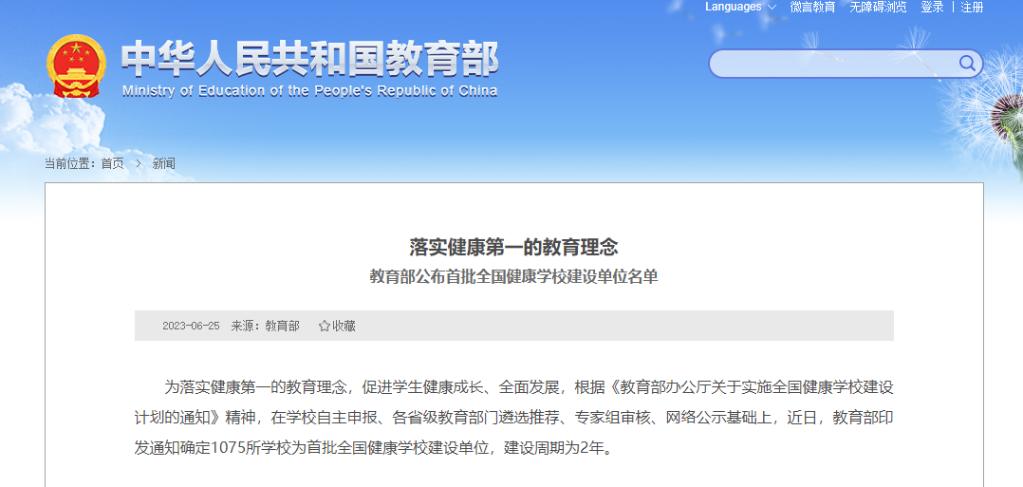 記者6月25日從教育部獲悉,為落實(shí)健康第一的教育理念,促進(jìn)學(xué)生健康成長(zhǎng)、全面發(fā)展,在學(xué)校自主申報(bào)、各省級(jí)教育部門(mén)遴選推薦、專家組審核、網(wǎng)絡(luò)公示基礎(chǔ)上,教育部近日印發(fā)通知,確定1075所學(xué)校為首批全國(guó)健康學(xué)校建設(shè)單位,建設(shè)周期為2年。