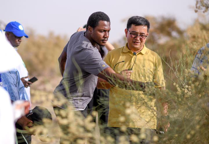 來自尼日利亞的非洲荒漠化控制倡議組織負(fù)責(zé)人奧馬爾·丹拉迪·達(dá)希魯?shù)弥笏髽溆心秃?、耐鹽堿地等特點(diǎn),他找到中國科學(xué)院新疆生態(tài)與地理研究所研究員徐新文,邊說邊比劃,想知道梭梭樹能否通過扦插而不是播種培育。