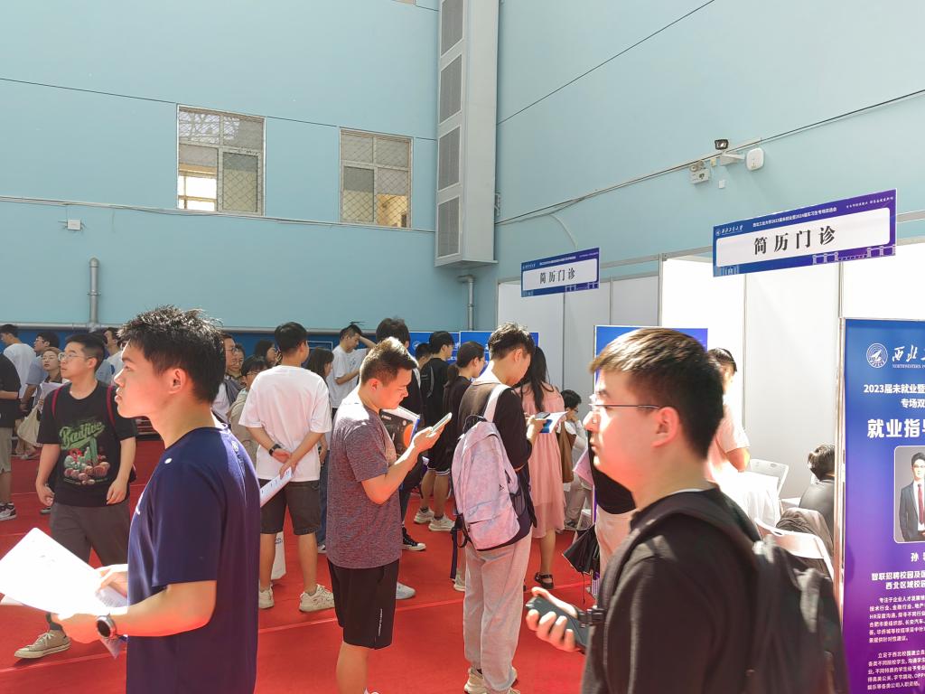 西北工業(yè)大學(xué)舉辦的招聘會(huì)上,學(xué)生在簡(jiǎn)歷門(mén)診咨詢。