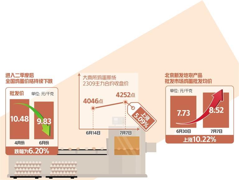 7月7日,大商所雞蛋期貨2309主力合約以4252點(diǎn)報(bào)收,比6月14日收盤4046點(diǎn)上漲5.09%。一些地方雞蛋現(xiàn)貨價(jià)格也顯著反彈。7日,北京新發(fā)地農(nóng)產(chǎn)品批發(fā)市場雞蛋批發(fā)均價(jià)為8.52元/千克,比上周同期(6月30日)的7.73元/千克上漲10.22%。“本周蛋價(jià)快速反彈不具有可持續(xù)性,僅是正常波動。當(dāng)前雞蛋供應(yīng)仍然充足,沒有出現(xiàn)供不應(yīng)求的狀況。”北京新發(fā)地農(nóng)產(chǎn)品批發(fā)市場統(tǒng)計(jì)部經(jīng)理劉通介紹。