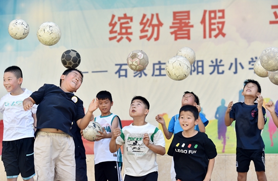 暑假期間,為減輕家長負擔,有效緩解學生暑期“看護難”問題,部分學校、社區(qū)開展暑期免費托管,為學生提供作業(yè)輔導和素質(zhì)課程等服務(wù),讓孩子們度過一個快樂、有意義的假期。 圖為7月10日,在石家莊市陽光小學,學生進行足球訓練。張曉峰/攝(新華社發(fā))