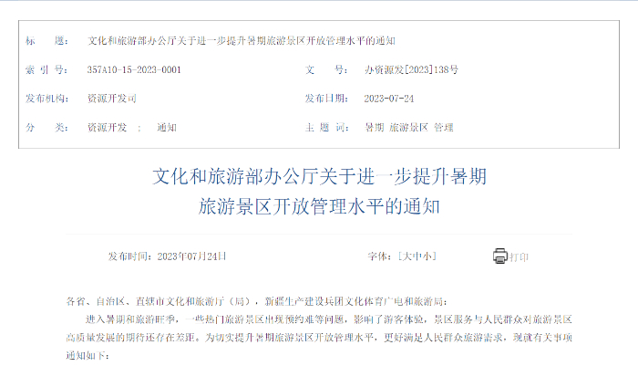 通知中稱,進(jìn)入暑期和旅游旺季,一些熱門旅游景區(qū)出現(xiàn)預(yù)約難等問題,影響了游客體驗,景區(qū)服務(wù)與人民群眾對旅游景區(qū)高質(zhì)量發(fā)展的期待還存在差距。為切實提升暑期旅游景區(qū)開放管理水平,更好滿足人民群眾旅游需求,現(xiàn)就有關(guān)事項通知如下: