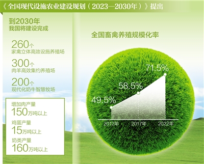 規(guī)?;O(shè)施化養(yǎng)殖助推畜牧業(yè)綜合產(chǎn)能提升?!度珖?guó)現(xiàn)代設(shè)施農(nóng)業(yè)建設(shè)規(guī)劃(2023—2030年)》(以下簡(jiǎn)稱(chēng)《規(guī)劃》)提出,到2030年建設(shè)完成260個(gè)家禽立體高效設(shè)施養(yǎng)殖場(chǎng)、200個(gè)肉牛高效集約養(yǎng)殖場(chǎng)、300個(gè)肉羊高效集約養(yǎng)殖場(chǎng)和200個(gè)現(xiàn)代化奶牛智慧牧場(chǎng),增加肉產(chǎn)量150萬(wàn)噸以上、雞蛋產(chǎn)量15萬(wàn)噸以上、奶類(lèi)產(chǎn)量160萬(wàn)噸以上,我國(guó)的肉蛋奶供應(yīng)保障水平將進(jìn)一步提高。