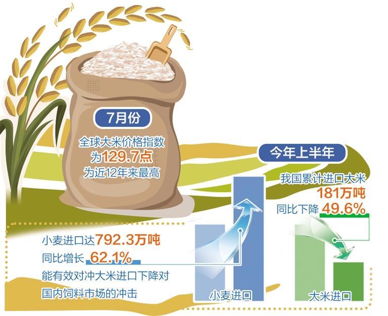 “為了確保大米進(jìn)口穩(wěn)定性,我國各類進(jìn)口主體也在推進(jìn)大米進(jìn)口多元化,避免來源地和品種過于集中帶來的進(jìn)口安全風(fēng)險(xiǎn)。”彭超說。一方面,推進(jìn)大米進(jìn)口來源地多元化。我國大米進(jìn)口來源地包括越南、緬甸、泰國、印度、巴基斯坦、柬埔寨等主產(chǎn)國。從去年10月起,我國開始逐步減少印度碎米進(jìn)口,印度已從過去幾年中國最大的大米供應(yīng)商滑落至第四位。另一方面,推進(jìn)糧食進(jìn)口品種多元化。減少大米進(jìn)口的同時,增加飼用小麥進(jìn)口。今年上半年,我國小麥進(jìn)口量達(dá)到792.3萬噸,較去年同期增長62.1%,能夠有效對沖大米進(jìn)口下降對國內(nèi)飼料市場的沖擊。