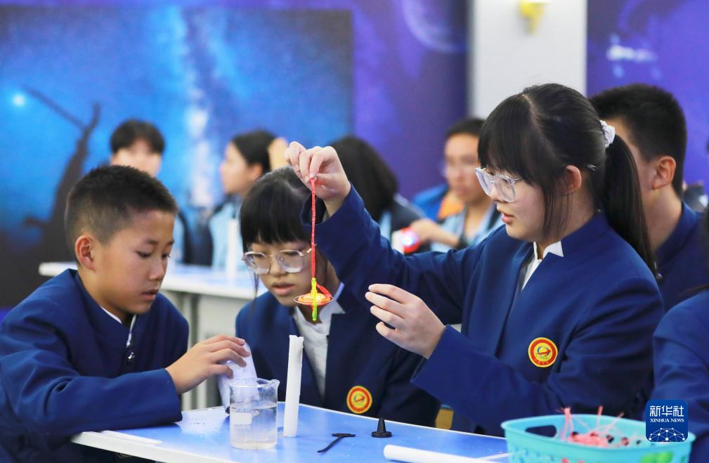 9月21日,在內(nèi)蒙古阿拉善盟額濟納旗,學(xué)生在做趣味實驗。新華社發(fā)(敖琪 攝)