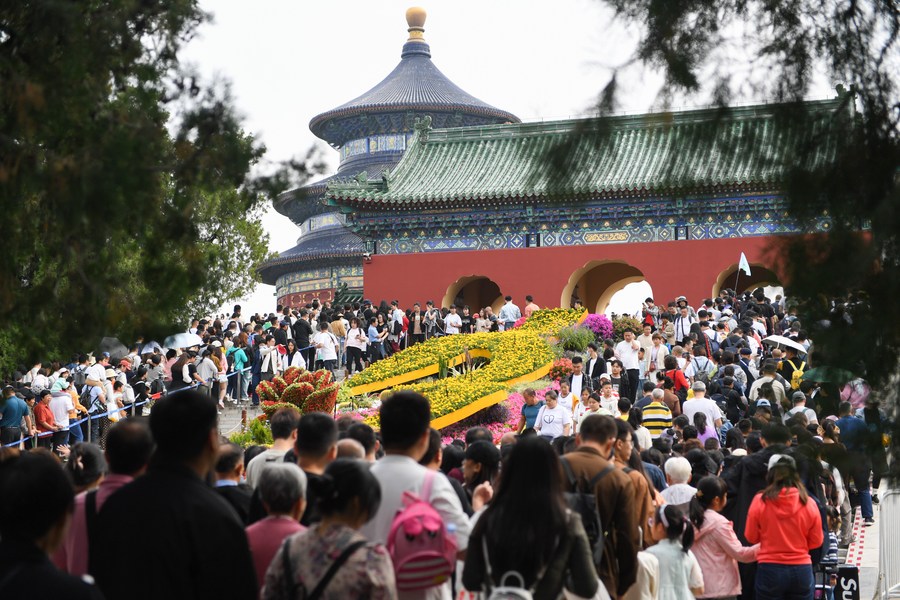 10月2日,游客在天壇公園內排隊前往祈年殿參觀。新華社記者 鞠煥宗 攝