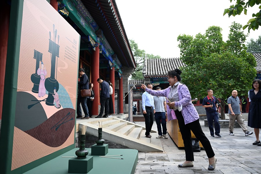 9月25日,在北京恭王府博物館一場展覽上,觀眾體驗投壺。新華社記者 金良快 攝