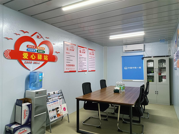 服務(wù)站門口即是S312省道,距離轉(zhuǎn)體梁主要施工工點不足500米,步行8到10分鐘可達。服務(wù)對象包括勞動工人、環(huán)衛(wèi)綠化工人、市政維修工人等戶外勞動者。站點內(nèi)溫暖明亮,空調(diào)和飲水機的冷熱水24小時提供便利,雨傘架、充電站解決燃眉之急。急救藥箱內(nèi)含有退燒貼和暖貼,感冒消炎、消毒止血常備藥以供不時之需,除此之外還增設(shè)特色閱讀區(qū),各類書籍、月刊、報紙可供勞動者休息時閱讀放松,并由工作人員定期更新。