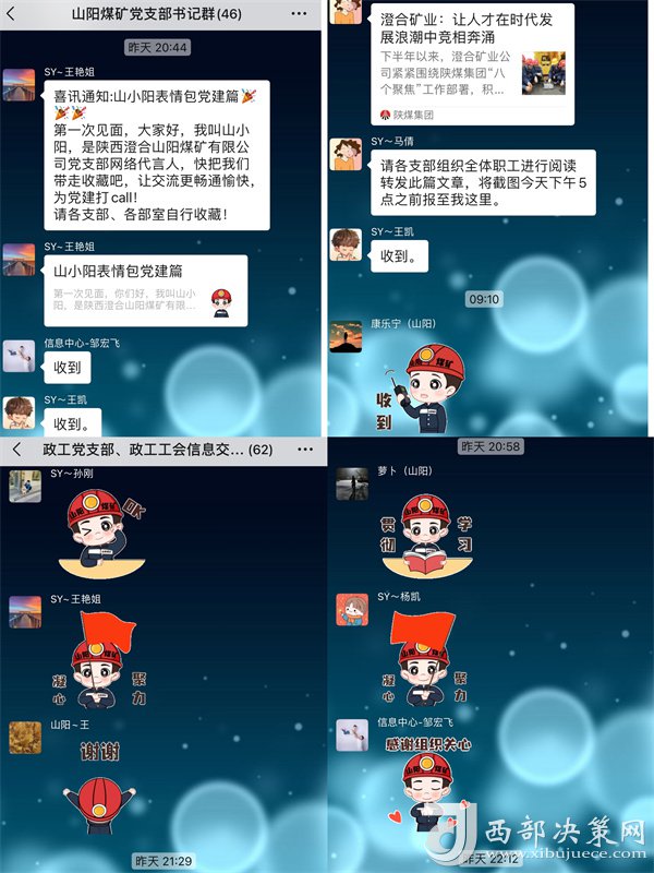 “這組表情包,是我們結(jié)合礦井黨支部標(biāo)準(zhǔn)化建設(shè)工作特點(diǎn)和實(shí)際情況而創(chuàng)新推出的,從表情包設(shè)計(jì)、上傳到上線經(jīng)過長達(dá)兩個月時間,它涵蓋了黨支部標(biāo)準(zhǔn)化日常工作的方方面面。”該公司黨群工作部副部長王艷介紹說。