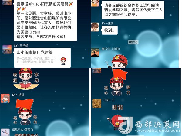 據(jù)了解,“山小陽”表情包一經(jīng)上線,便博得了干部職工的喜愛、互動、熱議以及推廣,“山小陽”表情包涵蓋“為支部爭光、上黨課啦、交黨費(fèi)啦、注意安全、感謝組織關(guān)心.......”等交流常用的表情,他們身穿帶有山陽煤礦標(biāo)識的工作服,頭戴安全帽,或微笑、或調(diào)皮、或嚴(yán)肅,多個動作,在微信平臺、微信工作群中任大家選擇和使用,促使山陽黨建文化以更加新穎的形式走進(jìn)黨員、干部職工的工作和生活中去,以接地氣、潛移默化的形式讓黨支部標(biāo)準(zhǔn)化建設(shè)工作入腦入心、見行見效。
