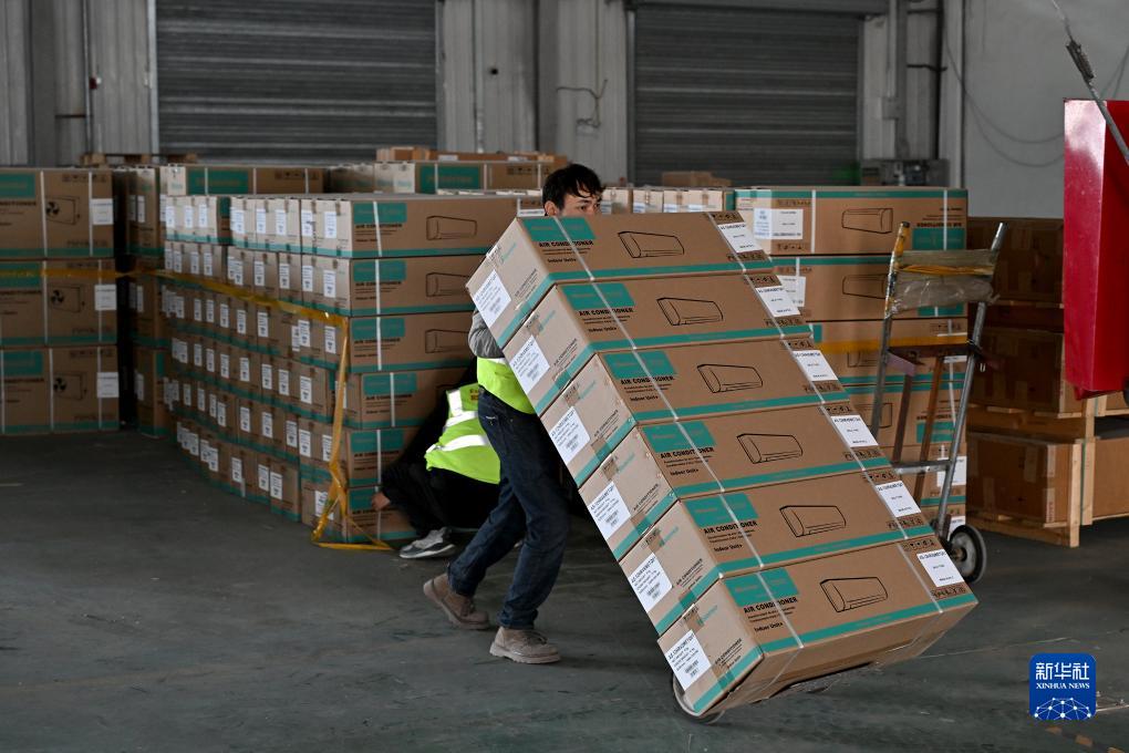 11月4日,在阿拉山口綜合保稅區(qū)內(nèi)的跨境電子商務分揀清關中心,工作人員將國產(chǎn)空調(diào)裝車準備運往國外。新華社記者 李鑫 攝