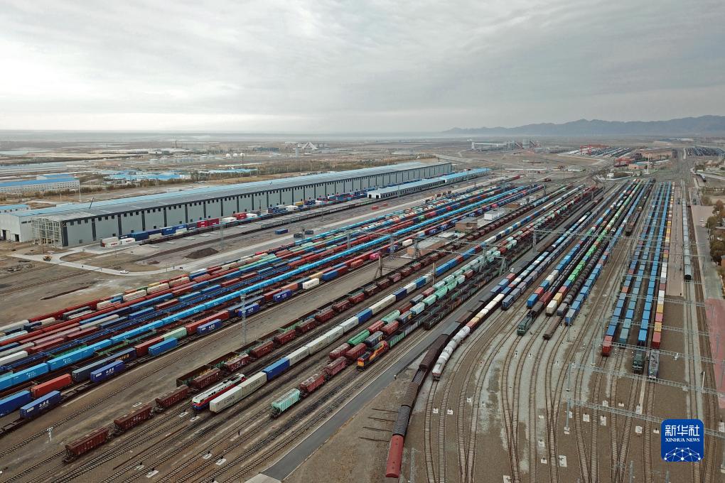 這是在阿拉山口站編組場拍攝的集結待發(fā)的貨運列車(無人機照片,11月4日攝)。新華社記者 李鑫 攝