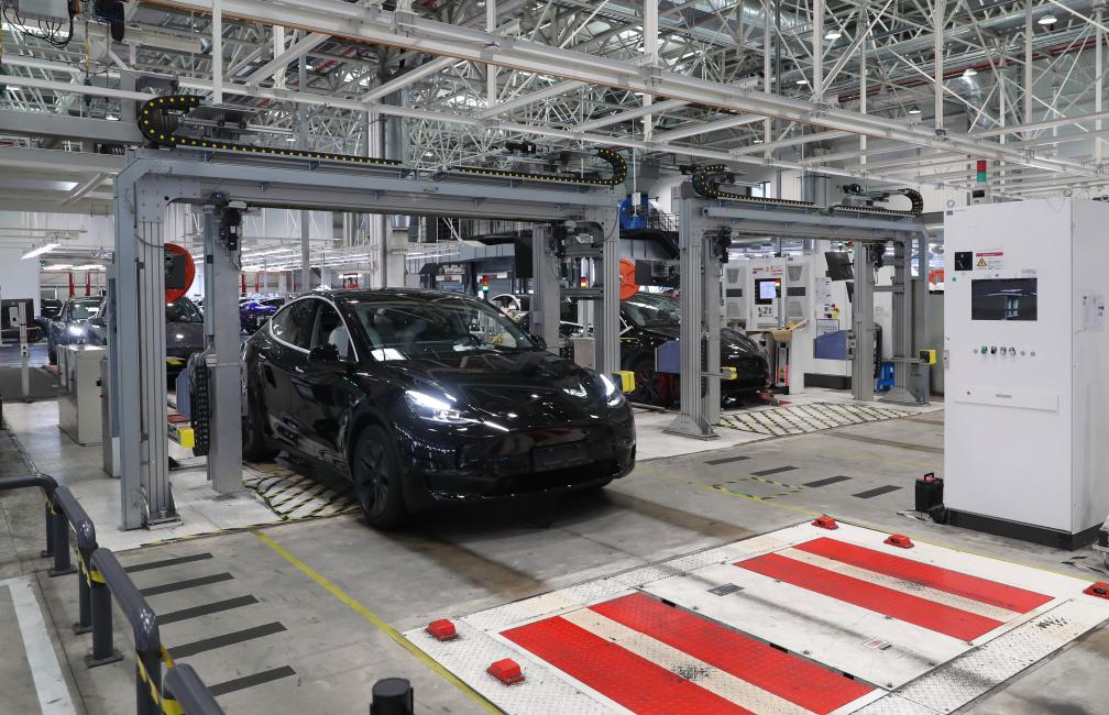12月22日,在特斯拉上海超級工廠內(nèi),一輛特斯拉電動汽車在進(jìn)行出廠前的車載電子設(shè)備檢測。新華社記者方喆 攝